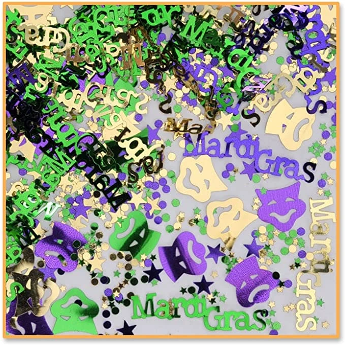 Celebrate Mardi Gras in Glittery Colors of Gold, Green & Purple with our Mardi gras Confetti Mix, sure to create excitement with details of Mardi Gras Mask, Wording and Sparkles. Package weighs 1/2 oz.